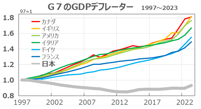 GDPデフレーター(名目GDP÷実質GDP、いわゆる物価)を同じG7で比較してみよう。