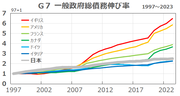 この伸び率も、G7と比べて低い。つまり、一般政府総債務の伸び率は、消費税を0%に減税して国債で対応したとしても、緩いままなのである。