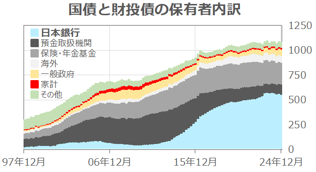 以下のグラフは、日本国債の保有者内訳の推移を、1997年12月~2024年12月で示したものである。