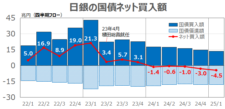 日銀は、2024年から国債の買入額が償還額を下回るようにしている。これが日銀の国債残高が減少している理由である。