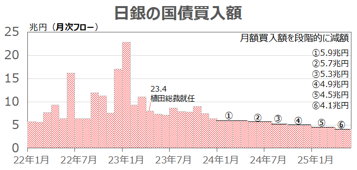 2024年に入ると、国債の買い入れ額はキャップをはめられ、①5.9兆円→②5.7兆円→③5.3兆円→…→⑥4.1兆円と段階的に減額されている。