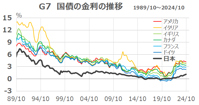 1980年代から2025年に至るまで、日本の長期金利は、G7で最も低い金利で推移し続けている(コロナの一時的な期間を除く)。
