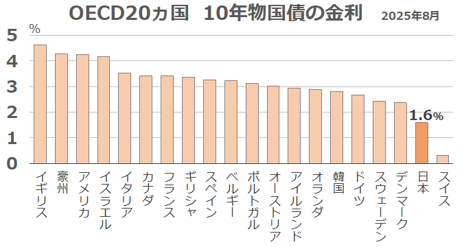 以下25年8月月次、OECD20ヵ国の長期金利を比較したデータである。